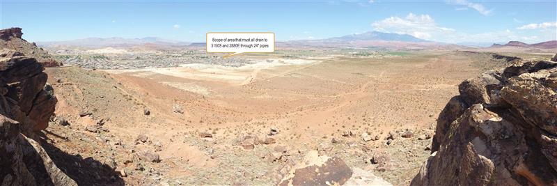 I've been trying to get a plan for action from the city before the entire area is built out but have been so far unsuccessful. I am told by the mayor that it's too late to do an adequate drainage system. I've been told by various city council members that they are looking into the situation but have not yet provided any concrete plans or solutions. Meanwhile the developers build away.. tying more 24" diameter pipes into more 24" pipes. I can't imagine there would be an impartial engineer in the world who would say this system is adequate. I am originally from a town which also received infrequent rain (Moorpark, California). It is a town with about half the population of St George and more absorbant soils. In Moorpark there is a network of huge culverts and tunnels leading to a river. Many of these were about 30' wide and 10-15 feet deep. Some of the smaller tunnels leading to these systems were about 8' in diameter. Las Vegas is larger than St George, but they have similar soil conditions and weather and they have an immense drainage system. St George's drainage system would appear to favor no one but the developers immediate bottom line in this area.